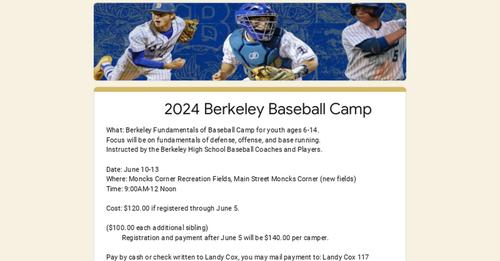 BERKELEY BASEBALL CAMP 2024 – June 10 – June 13.