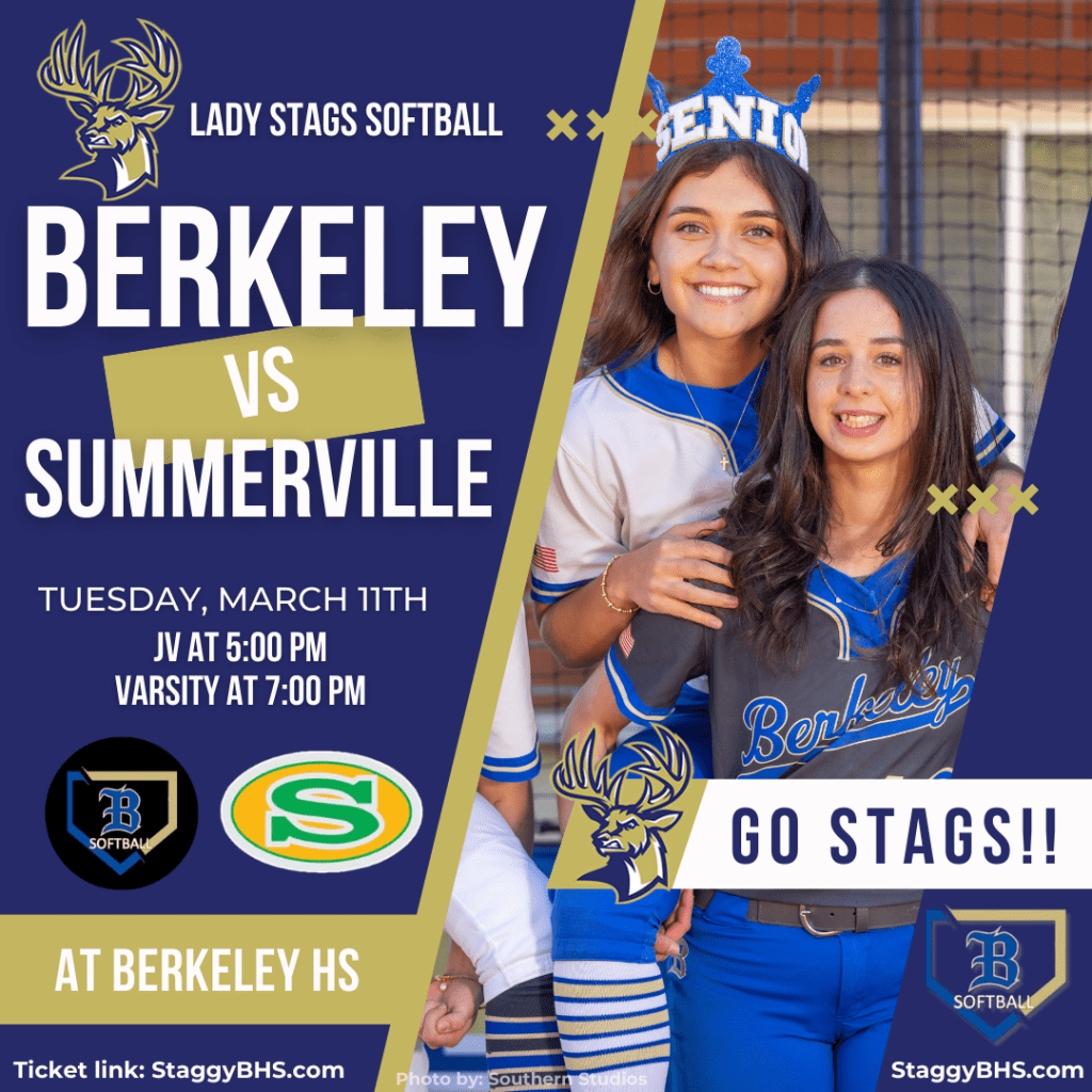 Berkeley Stags Softball is back on home turf for a must-see showdown against rival Summerville! Come out and cheer on our ladies as they battle it out for bragging rights! 💙💛