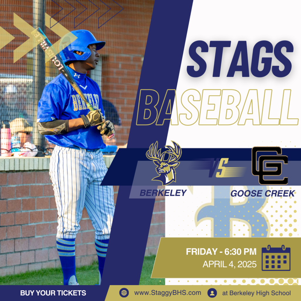 DATE UPDATE: Saturday, April 5th – It’s a big region showdown as Berkeley Varsity Baseball takes on rival Goose Creek at home! But that’s not all—it’s YOUTH NIGHT! 🎉