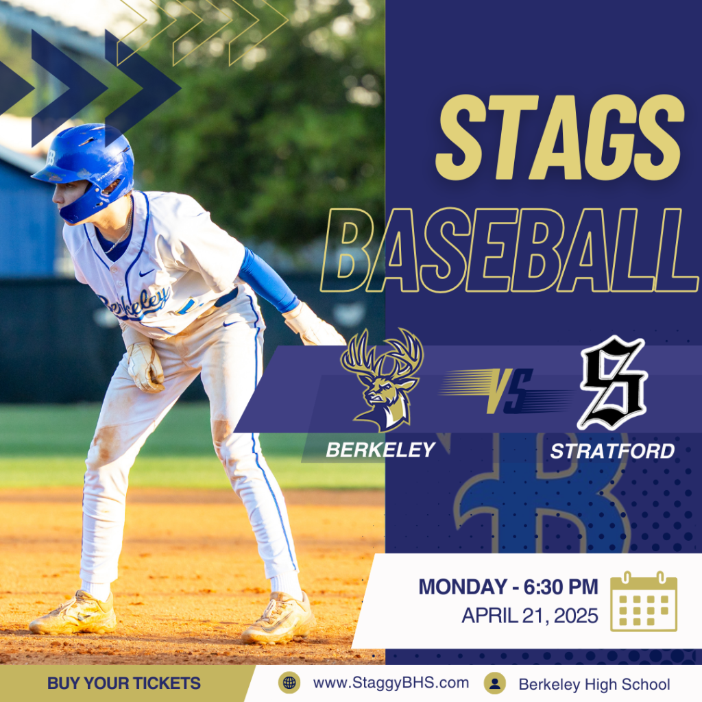 Stag Nation—we’re back in action! Our Berkeley Varsity Baseball squad is hosting Stratford High in a big-time regional matchup and we want YOU in the stands! 🎉