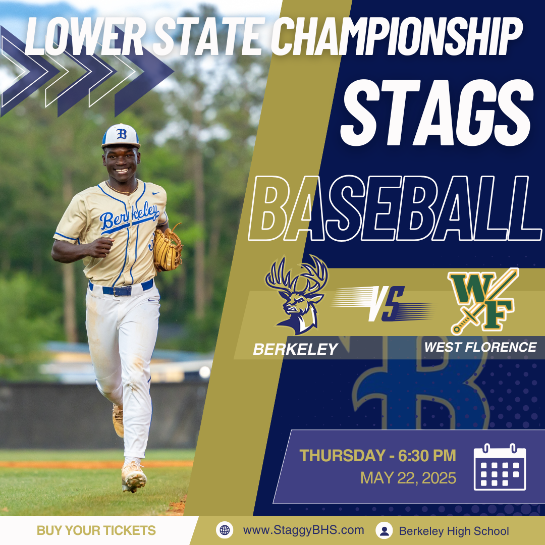 The road to the State Championship continues as your Berkeley Stags Baseball team faces off in the Lower State Championship series against West Florence! After a hard-fought Game 1, all eyes are on Game 2 — and it’s happening right here at home!