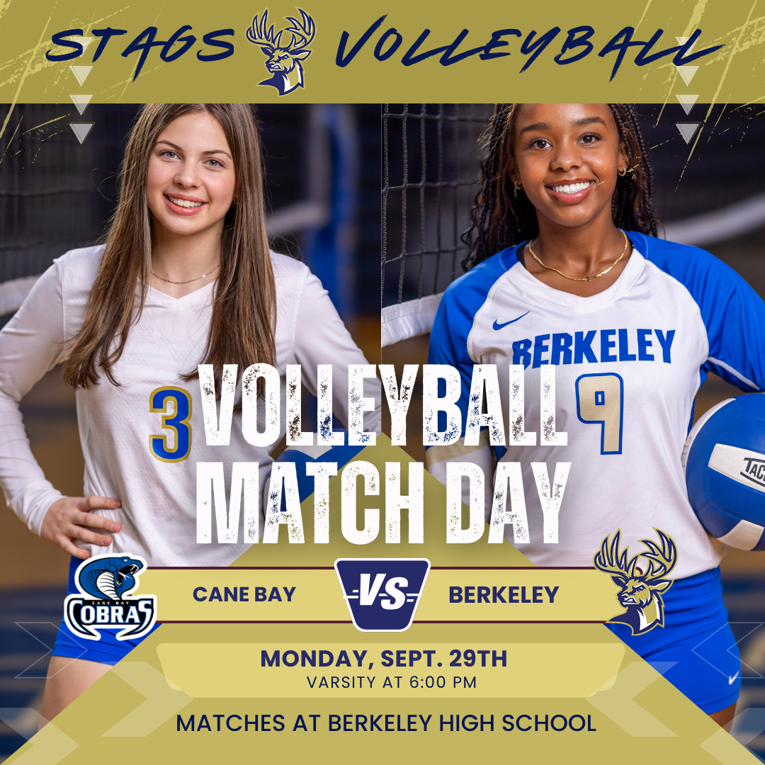 The Berkeley Stags Varsity Volleyball team is set to host Cane Bay on Monday, September 29th at 6:00 PM on the Stags Courts! 💙💛