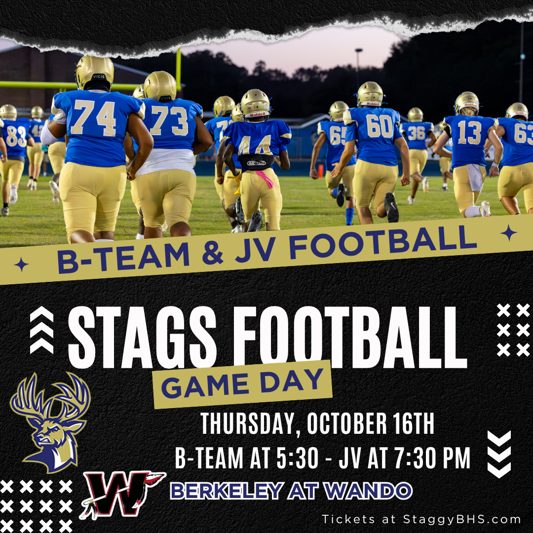 Get ready for an exciting night of football as our Berkeley High School Stags B-Team and JV Football teams hit the road to face the Wando Warriors on Thursday, October 16th! The B-Team kicks off at 5:30 PM, followed by JV at 7:30 PM.